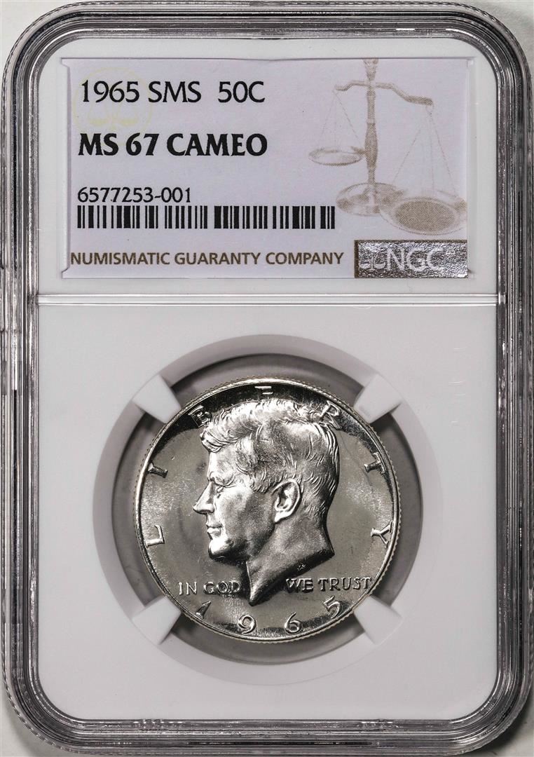 One 1965 SMS Kennedy Half Dollar Coin NGC MS67 Cameo. NGC Certified.
