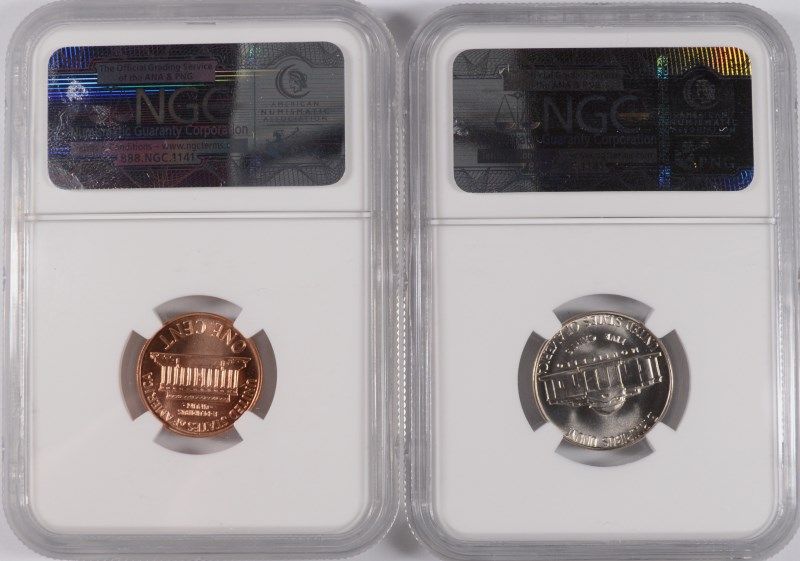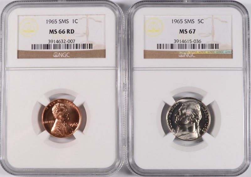 1965 SMS LINCOLN CENT NGC MS-66 RED AND 1965 SMS JEFFERSON NICKEL, NGC MS-67
