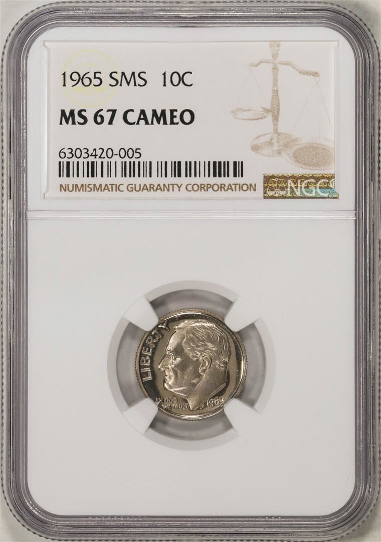 One 1965 SMS Roosevelt Dime Coin NGC MS67 Cameo. NGC Certified.