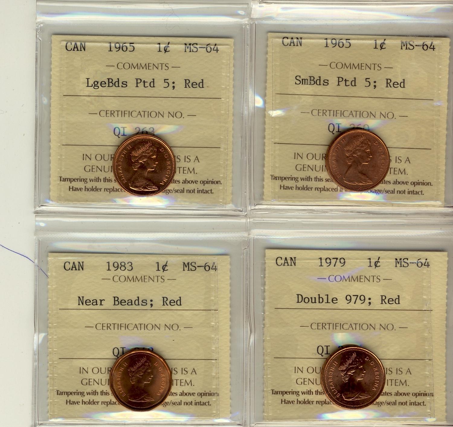 1965 SmBds Ptd, LgBds Ptd, 1979 Dbl 979 & 1983 Nr Bds 1¢ MS64RD. Lot of 4 coins all ICCS graded full red.