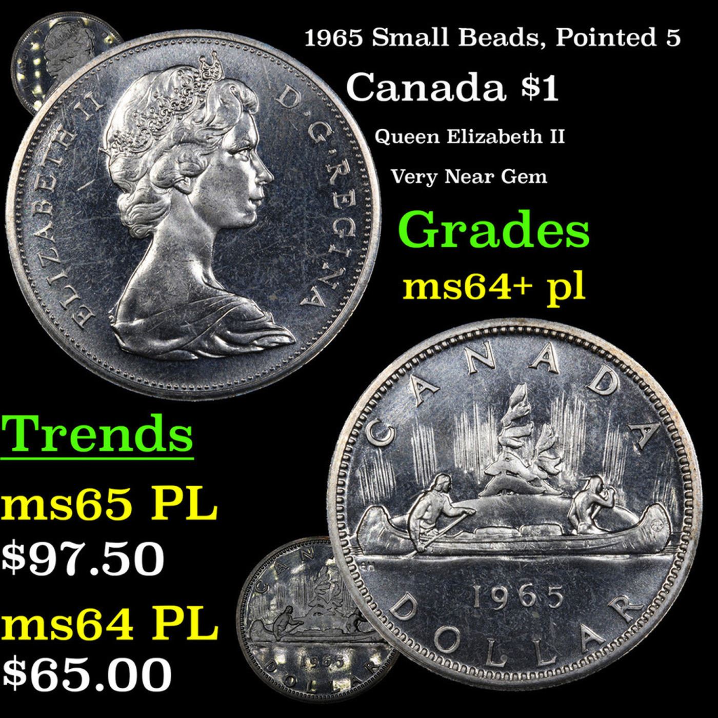 1965 Small Beads, Pointed 5 Canada Dollar $1 Grades Choice Unc+ PL. Why were there so many different varieties among the 1965 and 1966 Canada Dollars? It all comes down to trial and error. Technical flaws cropped up when striking began for the new portrait of Queen Elizabeth II, designed by Mary Gillick. Originally, the 1965 Queen Elizabeth II Dollars were struck bearing the Small Beads variety. However, this motif, featuring a flat field, proved to be harsh on the dies and led to a short die life.Adjustments were made making the field more concave and upward sloping toward the rim, resulting in the Medium Beads variety. Finally, Royal Canadian Mint officials fine-tuned the obverse, further sharpening the dished concavity of the fields and increasing the size of the beads, producing the Large Beads variety. Along with these changes, which are seen on both the 1965 and 1966 dollars, there were also refinements to the shaping of the “5” on the 1965 dollars. Some of these coins bear a “5” with a bluntly edged tail, others showcase a pointed tail on the “5.” The “Blunt 5” is known among only the Small Beads and Large Beads varieties, while the “Pointed 5” is paired with all three bead varieties.While some hobbyists assemble Canadian Dollars by year and bypass the major varieties, a great many enthusiasts pursue the different 1965 and 1966 varieties as budgets allow. One of the most common paths collectors take with these varieties is to incorporate a complete set of the 1965 Canadian Dollars, as these are generally not cost prohibitive and collectively represent the various bead sizes encountered on the Canadian Dollars of the era. Collectors of greater financial means also include the 1966 varieties, which encompass the rare 1966 Small Beads Dollars.Those who venture into collecting Canadian Dollars encounter many other varieties that are similar to the 1965 and 1966 notables mentioned here. Hobbyists who study 1967 Canadian Dollars will also find small- and large-bead varieties on the reverse of this popular coin bearing a flying goose to honor the centennial of Canada’s confederation.Additionally, there are numerous varieties involving the presence of Queen Elizabeth’s shoulder strap on 1953 and 1954 Canada Dollars, the details of the water lines on the various 1950s dollars, and the strength of detail in the Northern Lights on the Voyageur reverse of the early 1960s. With so many interesting and colorful varieties to their name, it’s no wonder Canadian Dollars have long been one of the most popular series for collectors throughout North America and around the world!