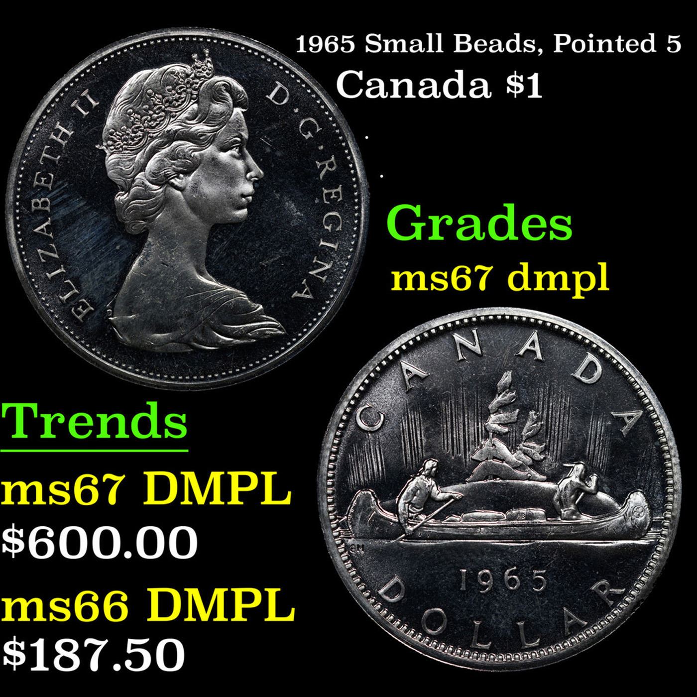 1965 Small Beads, Pointed 5 Canada Dollar $1 Grades GEM++ DMPL