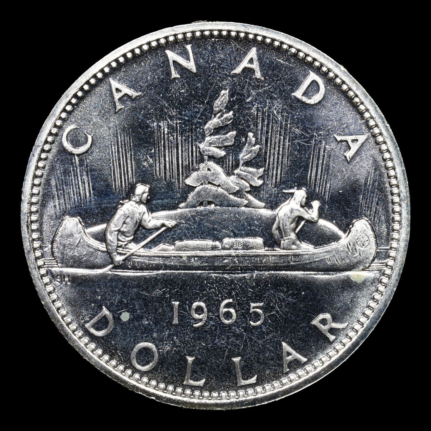1965 Small Beads, Pointed 5 Canada Dollar $1 Grades GEM++ PL. Why were there so many different varieties among the 1965 and 1966 Canada Dollars? It all comes down to trial and error. Technical flaws cropped up when striking began for the new portrait of Queen Elizabeth II, designed by Mary Gillick. Originally, the 1965 Queen Elizabeth II Dollars were struck bearing the Small Beads variety. However, this motif, featuring a flat field, proved to be harsh on the dies and led to a short die life.Adjustments were made making the field more concave and upward sloping toward the rim, resulting in the Medium Beads variety. Finally, Royal Canadian Mint officials fine-tuned the obverse, further sharpening the dished concavity of the fields and increasing the size of the beads, producing the Large Beads variety. Along with these changes, which are seen on both the 1965 and 1966 dollars, there were also refinements to the shaping of the “5” on the 1965 dollars. Some of these coins bear a “5” with a bluntly edged tail, others showcase a pointed tail on the “5.” The “Blunt 5” is known among only the Small Beads and Large Beads varieties, while the “Pointed 5” is paired with all three bead varieties.While some hobbyists assemble Canadian Dollars by year and bypass the major varieties, a great many enthusiasts pursue the different 1965 and 1966 varieties as budgets allow. One of the most common paths collectors take with these varieties is to incorporate a complete set of the 1965 Canadian Dollars, as these are generally not cost prohibitive and collectively represent the various bead sizes encountered on the Canadian Dollars of the era. Collectors of greater financial means also include the 1966 varieties, which encompass the rare 1966 Small Beads Dollars.Those who venture into collecting Canadian Dollars encounter many other varieties that are similar to the 1965 and 1966 notables mentioned here. Hobbyists who study 1967 Canadian Dollars will also find small- and large-bead varieties on the reverse of this popular coin bearing a flying goose to honor the centennial of Canada’s confederation.Additionally, there are numerous varieties involving the presence of Queen Elizabeth’s shoulder strap on 1953 and 1954 Canada Dollars, the details of the water lines on the various 1950s dollars, and the strength of detail in the Northern Lights on the Voyageur reverse of the early 1960s. With so many interesting and colorful varieties to their name, it’s no wonder Canadian Dollars have long been one of the most popular series for collectors throughout North America and around the world!