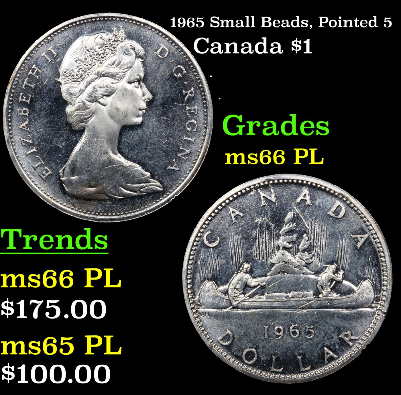 1965 Small Beads, Pointed 5 Canada Dollar $1 Grades GEM+ UNC PL.