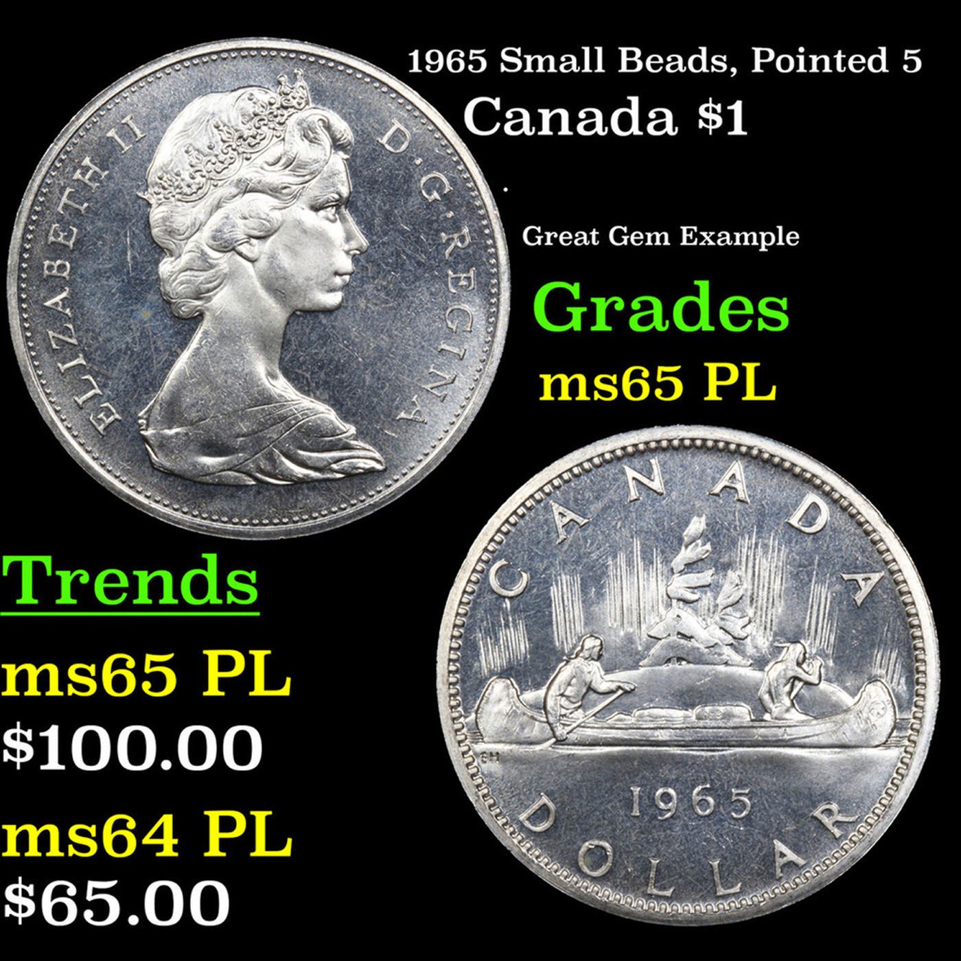 1965 Small Beads, Pointed 5 Canada Dollar $1 Grades GEM Unc PL.