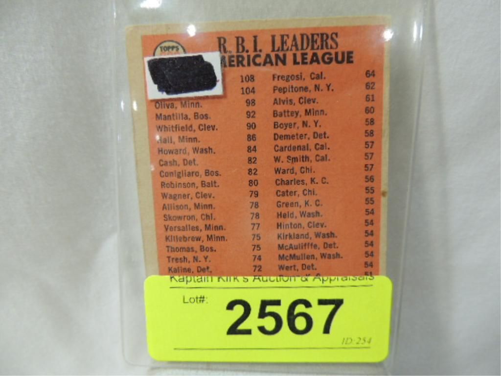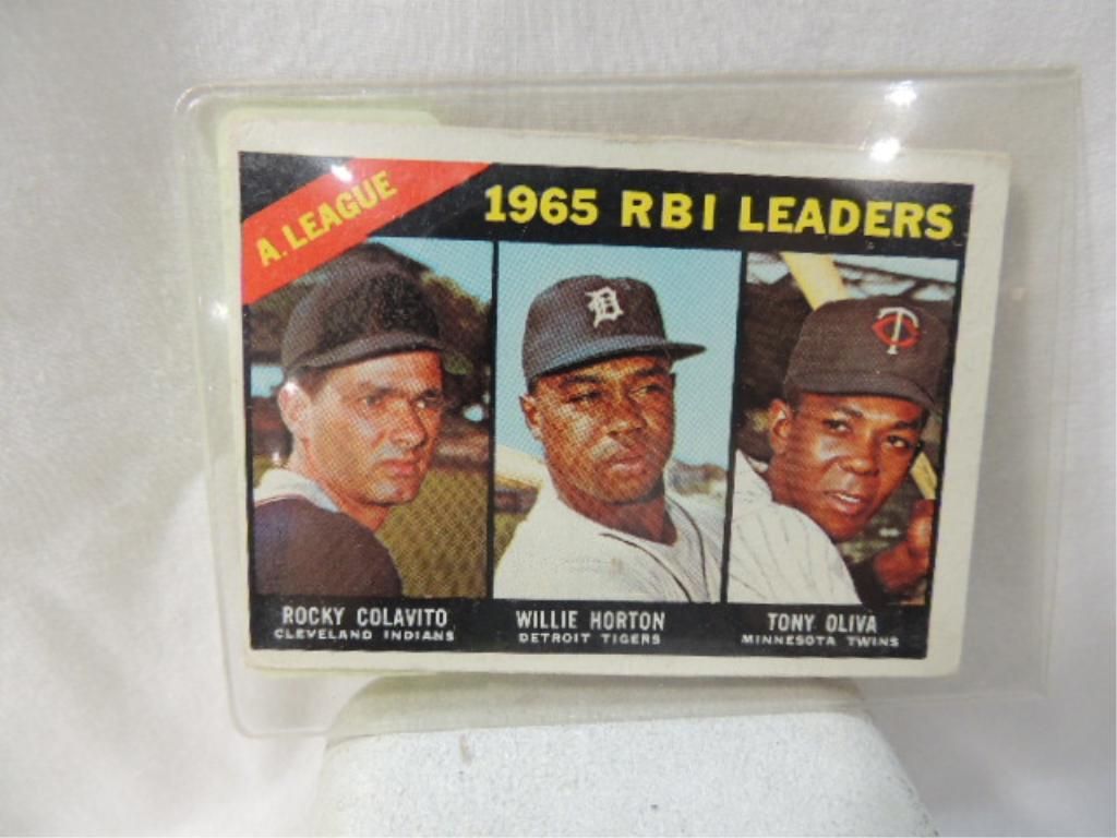 1965 TOPPS RBI LEADERS BASEBALL CARD. ROCKY COLAVITO WILLIE HORTON TONY OLIVA. AS SHOWN SEE PHOTO FOR MORE DETAILS.