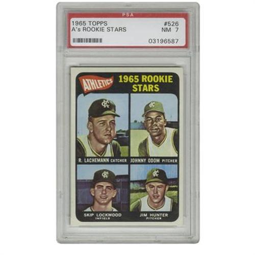 <B>1965 Topps A's Rookie Stars #526 PSA NM 7.</B></I> Blue Moon Odom and Catfish Hunter join forces on this high-grade representation. Fine centering and gloss.<BR><BR><b>Shipping:</b> Requires 3rd Party Shipping (<a target="_blank" href="http://www.heritageauctions.com/common/shipping.php">view shipping information</a>)