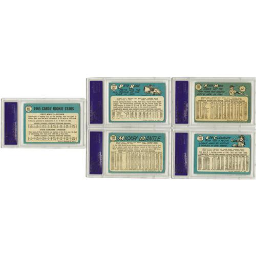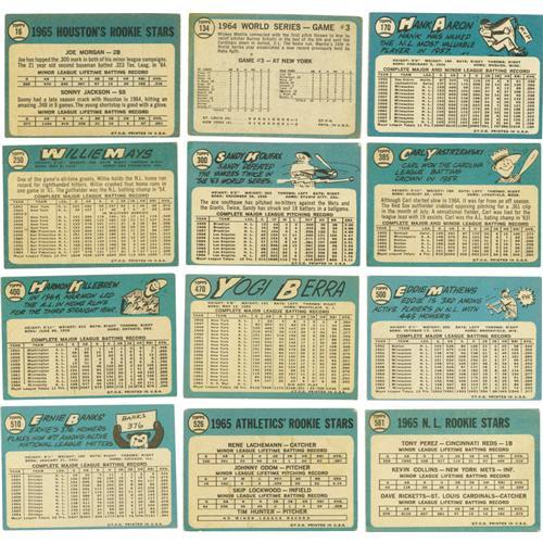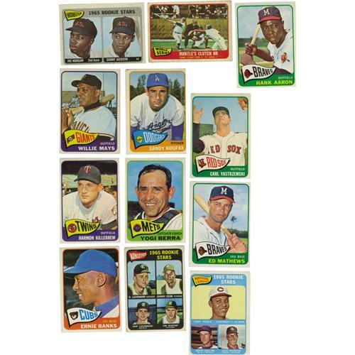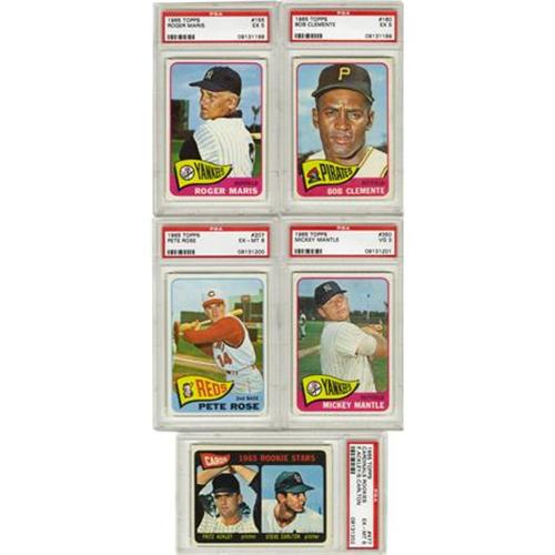 <B>1965 Topps Baseball Complete Set (598).</B></I> The 1965 Topps baseball series consists of 598 cards and certain cards in the high-number series (#523-598) were produced in lesser quantities than the rest of the series. A total of five cards have been graded by PSA with an aggregate SMR value of $355. Graded cards - <B>PSA 6:</B></I> #207 Rose, 477 Carlton; <B>PSA 5:</B></I> #155 Maris, 160 Clemente; <B>PSA 3:</B></I> #350 Mantle. Ungraded cards include #16 Morgan (VG/EX), 134 World Series Game (G/VG), 170 Aaron (EX), 250 Mays (VG), 300 Koufax (VG), 385 Yastrzemski (VG), 400 Killebrew (EX/MT), 470 Berra (VG), 500 Mathews (EX), 510 Banks (EX), 526 Hunter (G/VG), 581 Perez (VG). Set grades 40% EX to EX/MT, 60% VG to VG/EX (some lesser).