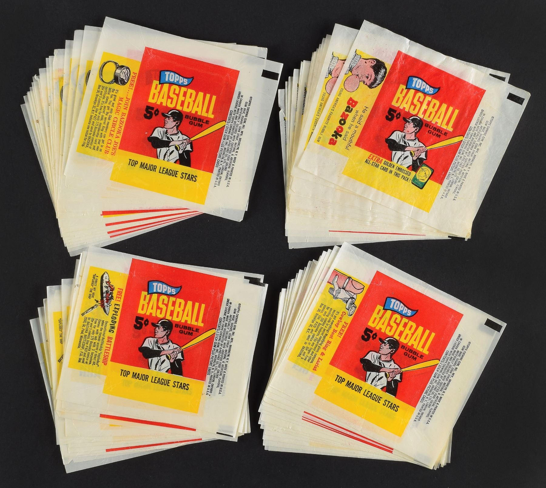 Total of 64 wrappers, with FIVE different varieties of ad/side panels. Most of the wrappers are excellent overall condition, while some have small tears, creasing. Only a few are lower grade. Very colorful red and yellow-themed wrappers. Includes: Bazooka Gum (8), Cowboy boot ring (16), Exploding battleship (12), Exploding battleship – Embossed card front (12) and Magic circle club (16).