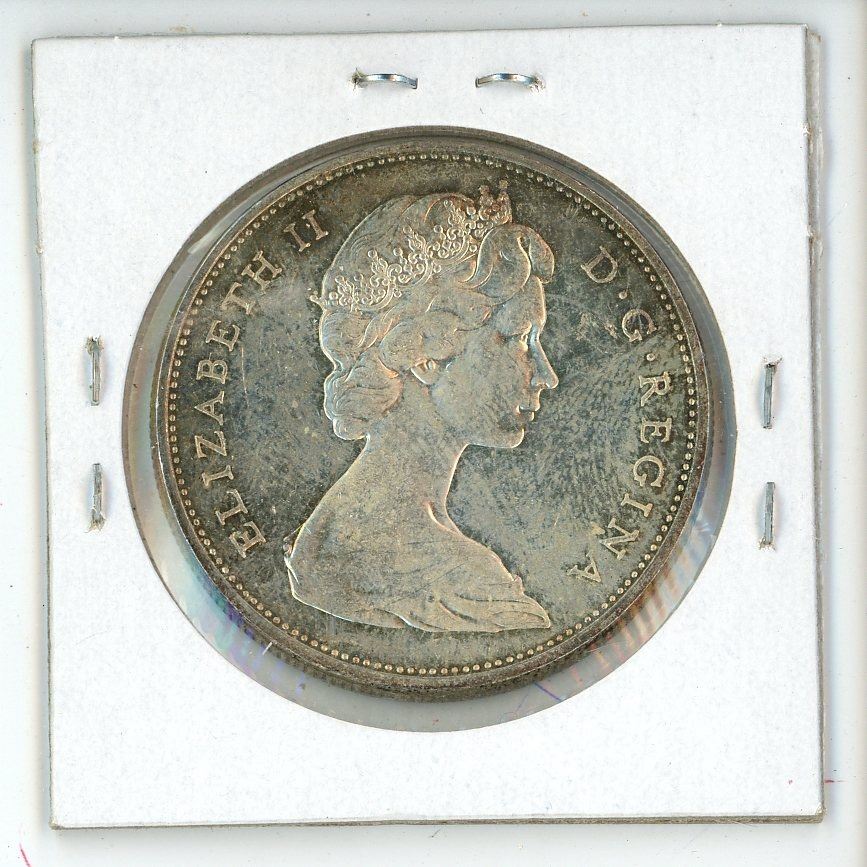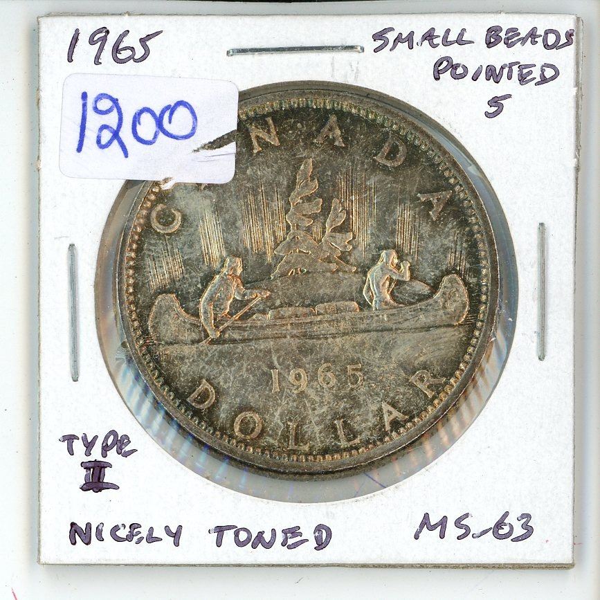 1965 Type I Canadian Silver Dollar. Small Beads, Pointed 5. MS-63. Nicely Toned.