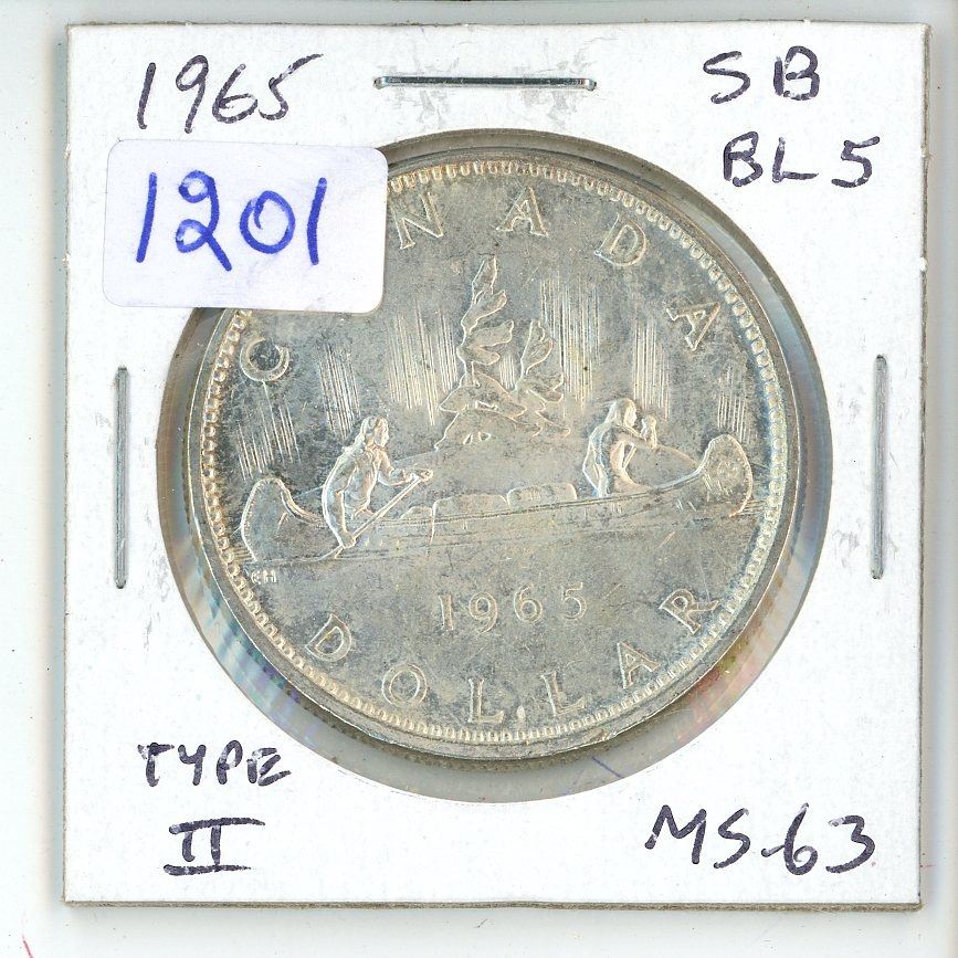 1965 Type II Canadian Silver Dollar. Small Beads, Blunt 5. MS-63. Lustrous.