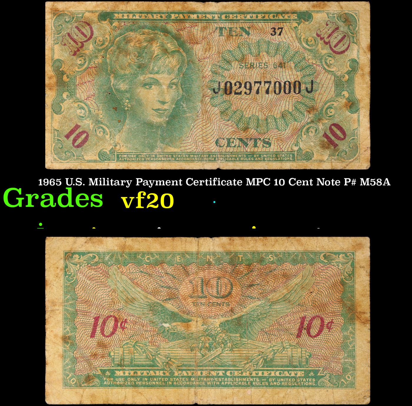 1965 U.S. Military Payment Certificate MPC 10 Cent Note P# M58A Grades vf, very fine