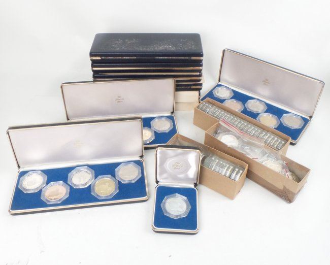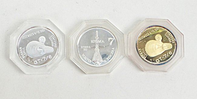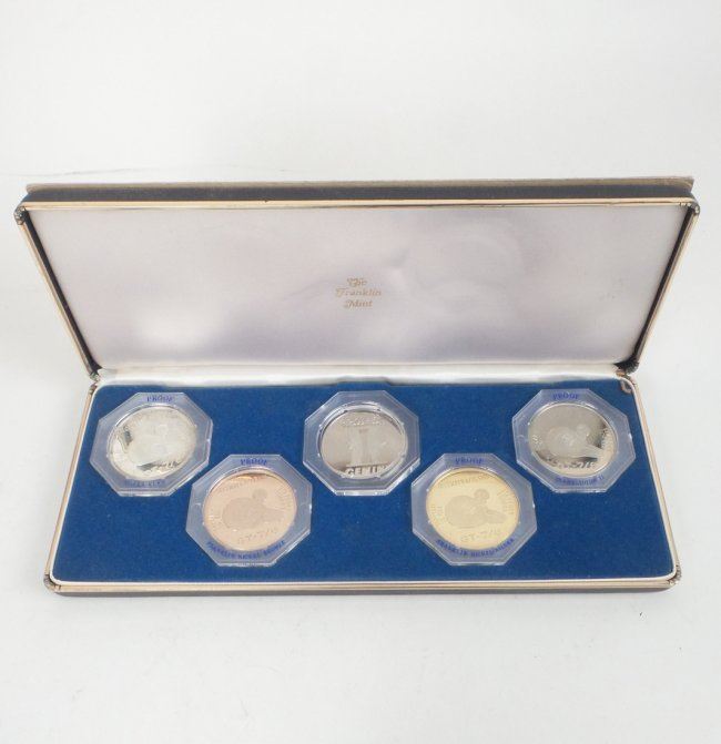 [NASA Space Exploration] Gemini 6 & Gemini 7, Franklin Mint / Spacecraft Medals Inc. commemorative medals. Issued for the first space rendezvous that occurred on Dec. 15, 1965 between the Gemini VI and Gemini VII. All medals bear both crews' names: Stafford, Schirra, Borman, and Lovell. Comprises nine complete proof sets of five medals each, over sixty silver-plated medals, and one sterling silver medal. All measure 38mm. Most in proof condition with some toning. Over 100 medals total.