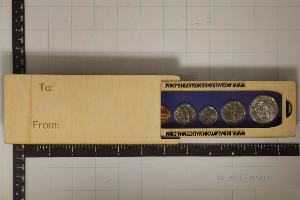 ENGRAVED WOODEN GIFT BOX THAT SLIDES OUT TO SHOW THE COINS FROM BOTH SIDES. 40% SILVER JOHN F. KENNEDY HALF DOLLAR. BOX CAN BE ENGRAVED WITH SOMEONES NAME FOR $5.00 EXTRA IF WE ARE CONTACTED BEFORE WE SHIP IT OUT ON