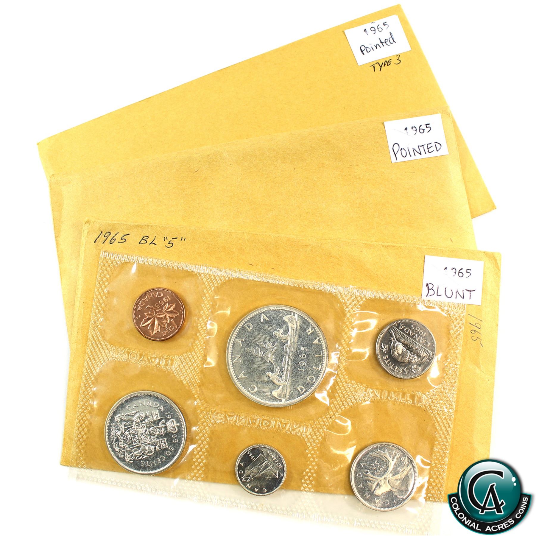 1965 Uncirculated Proof Like Set Collection. 1965 Pointed 5 Set, 1965 Blunt 5 Set, and the Scarce 1965 SmBds Pt5 Dollar with Variety 3 1ct. 3pcs.