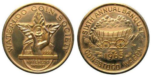 Waterloo Coin Club 6th annual Banquet, 1965 Gold medal. Obverse: Hand holding a coin against a maple leaf, with WATERLOO COIN CLUB, EST. 1959, WATERLOO ONTARIO. Reverse: wagon, with SIXTH ANNUAL BANQUET 1965 CONESTOGO WAGON.  29.4 MM round with a weight o
