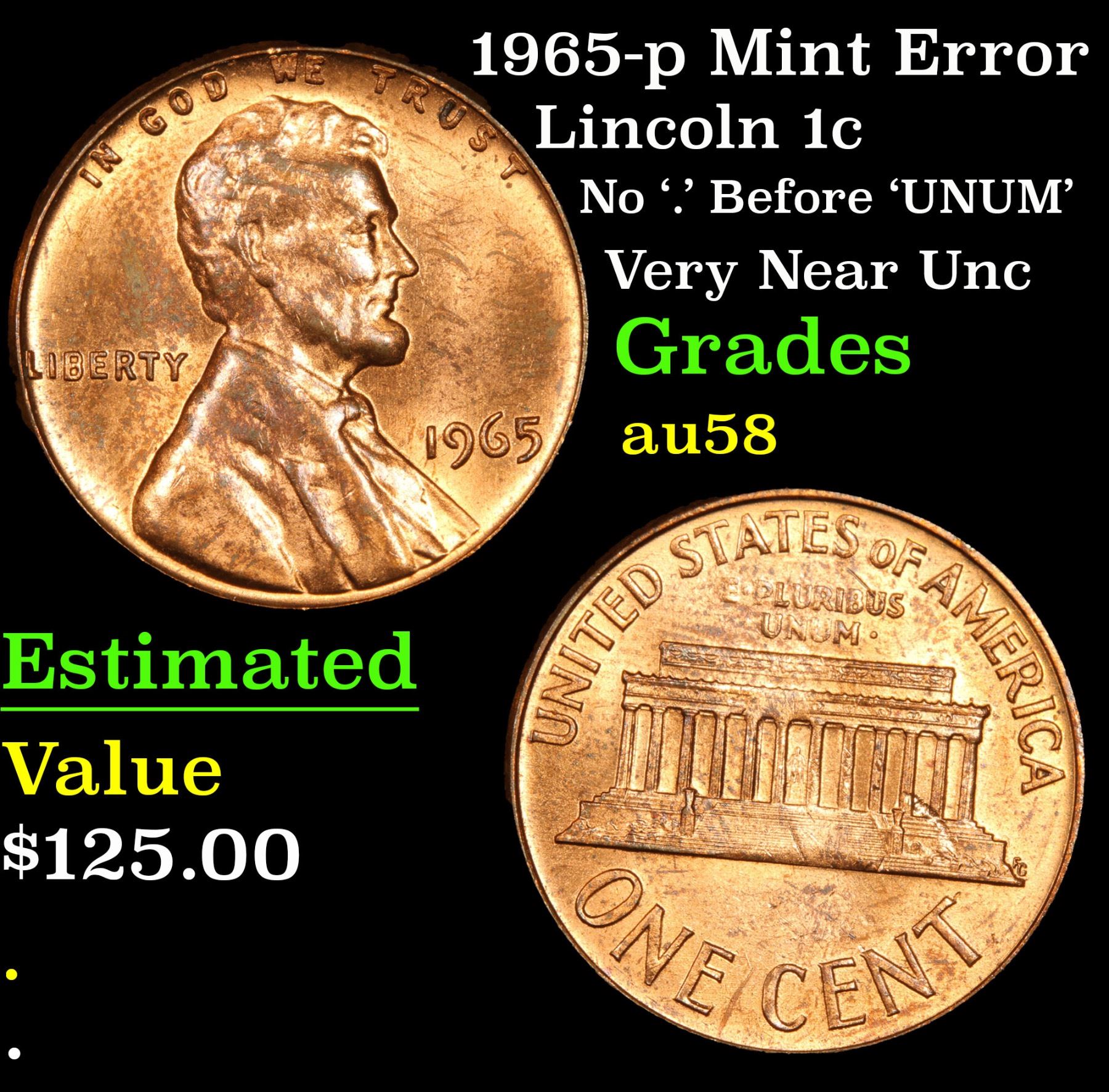 1965-p Mint Error No '.' Before 'UNUM' Very Near Unc Lincoln Cent 1c Grades Choice AU/BU Slider.