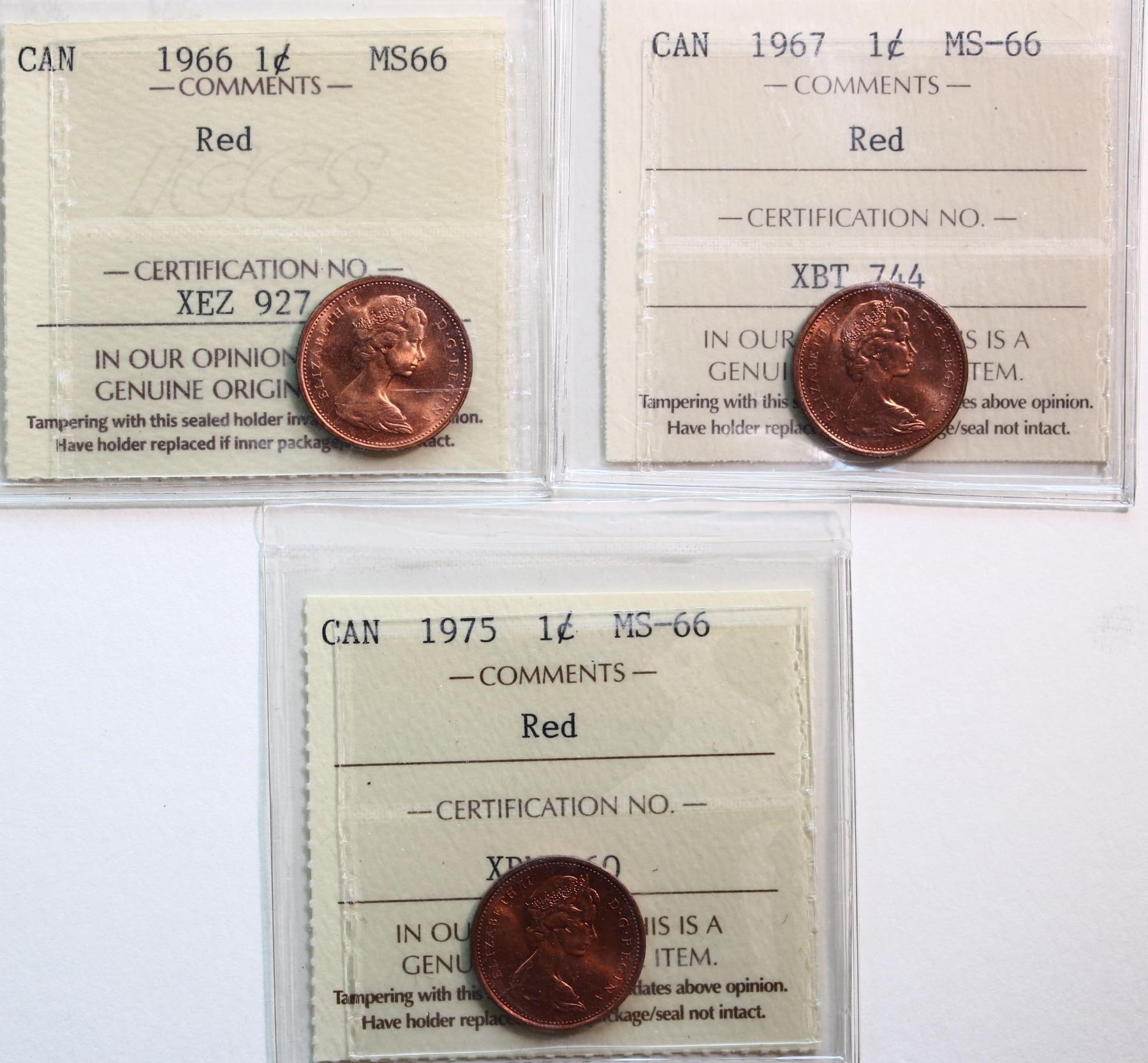 1966 1¢. 1967, 1975. Lot of 3 coins all ICCS Superb Gem Mint State-66