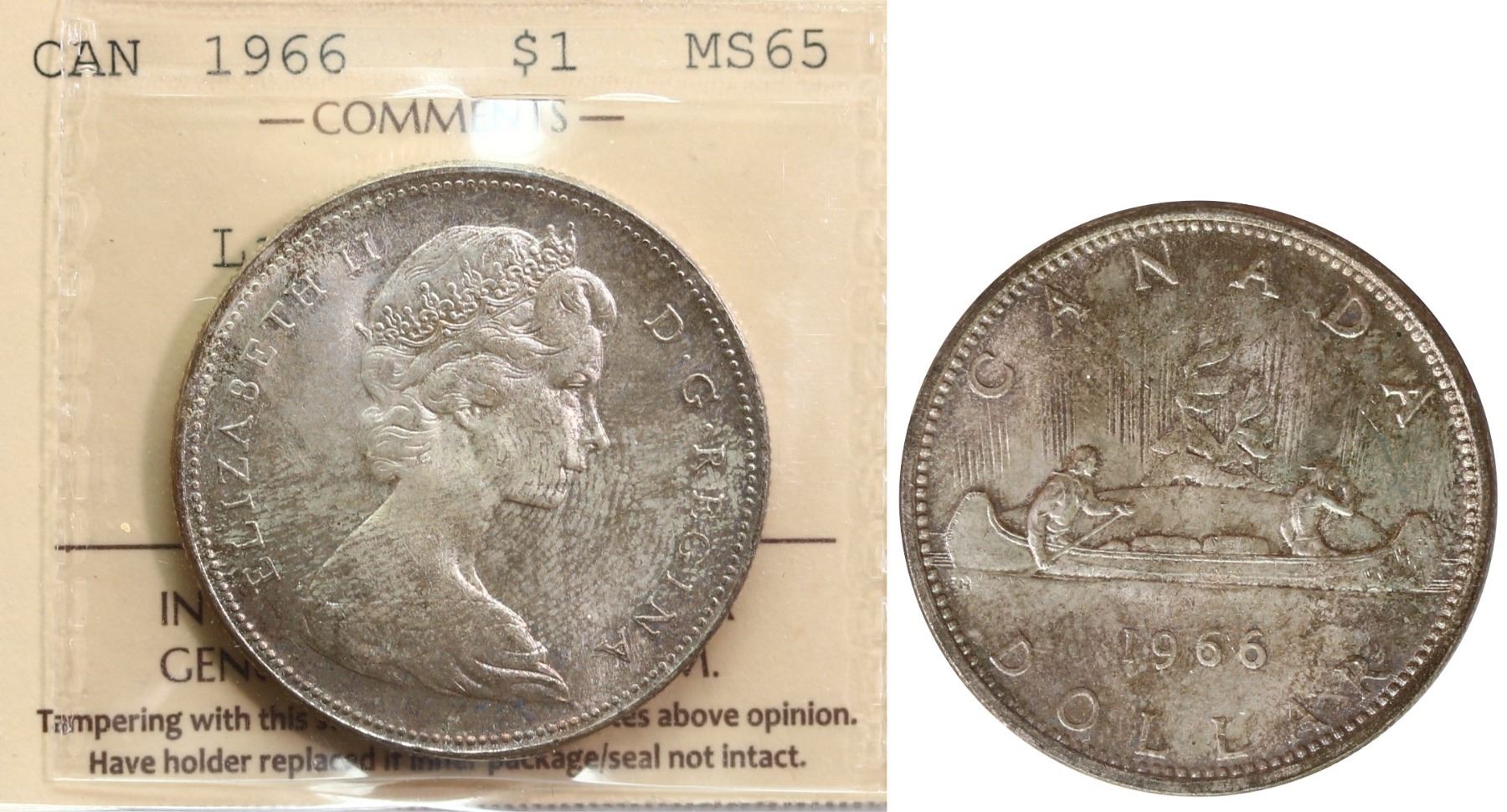 1966 $1 "Large Beads" ICCS Gem Mint State-65, attractive toning over full underlying lustre.