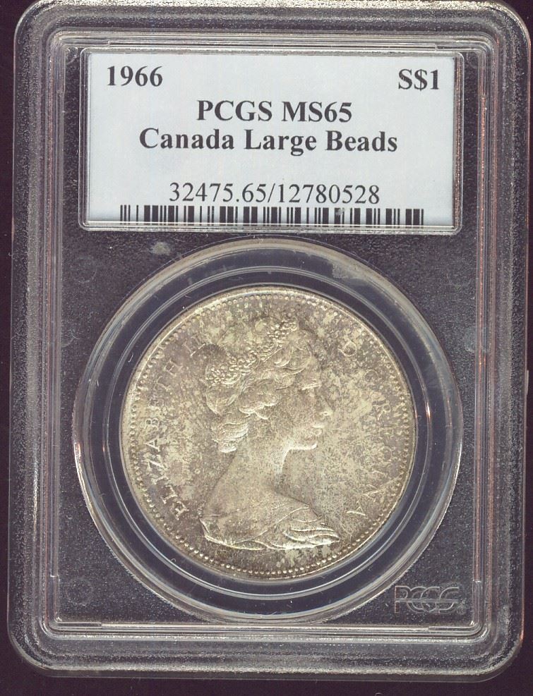 1966 $1 PCGS MS65. Attractive green and gold scattered tones.