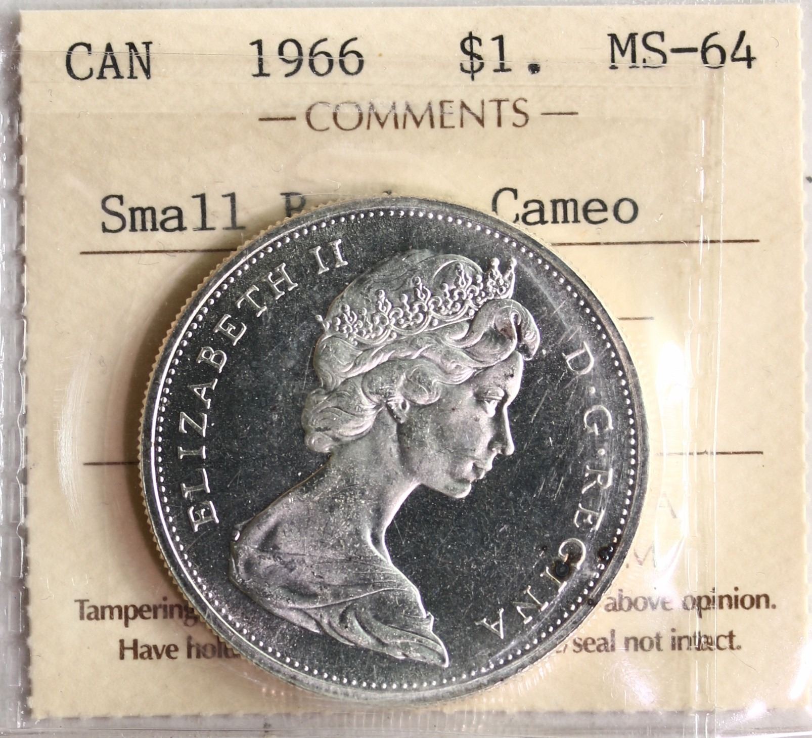 1966 $1 "Small Beads" ICCS Very Choice Mint State-64 Cameo Fully brilliant and lustrous with strong cameo contrast. A very rare and sought after variety!