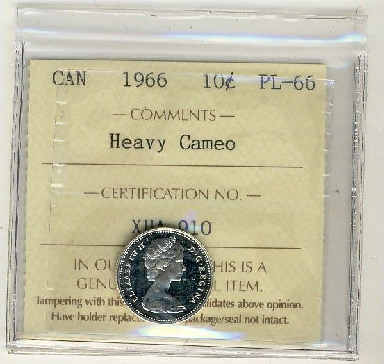 1966 10 Cents, PL66; Heavy Cameo. ICCS certified.