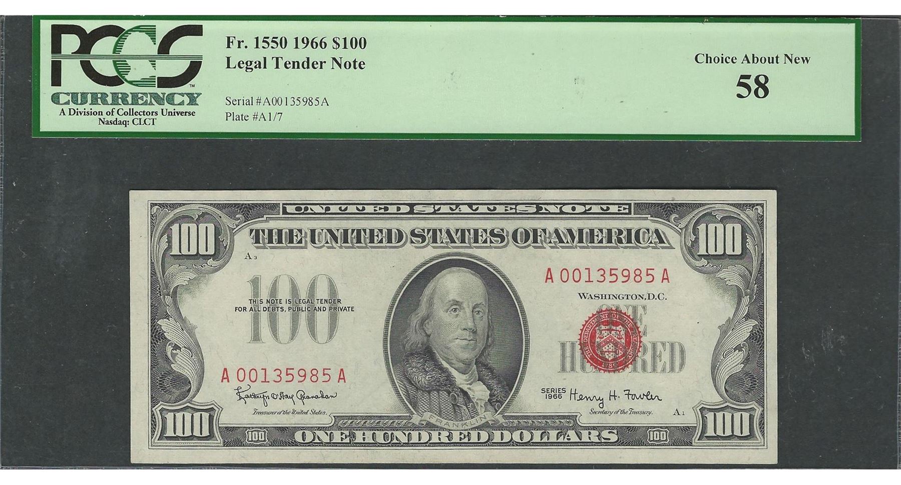 One 1966 $100 Legal Tender Note Fr.1550 PCGS Choice About New 58. PCGS Graded.