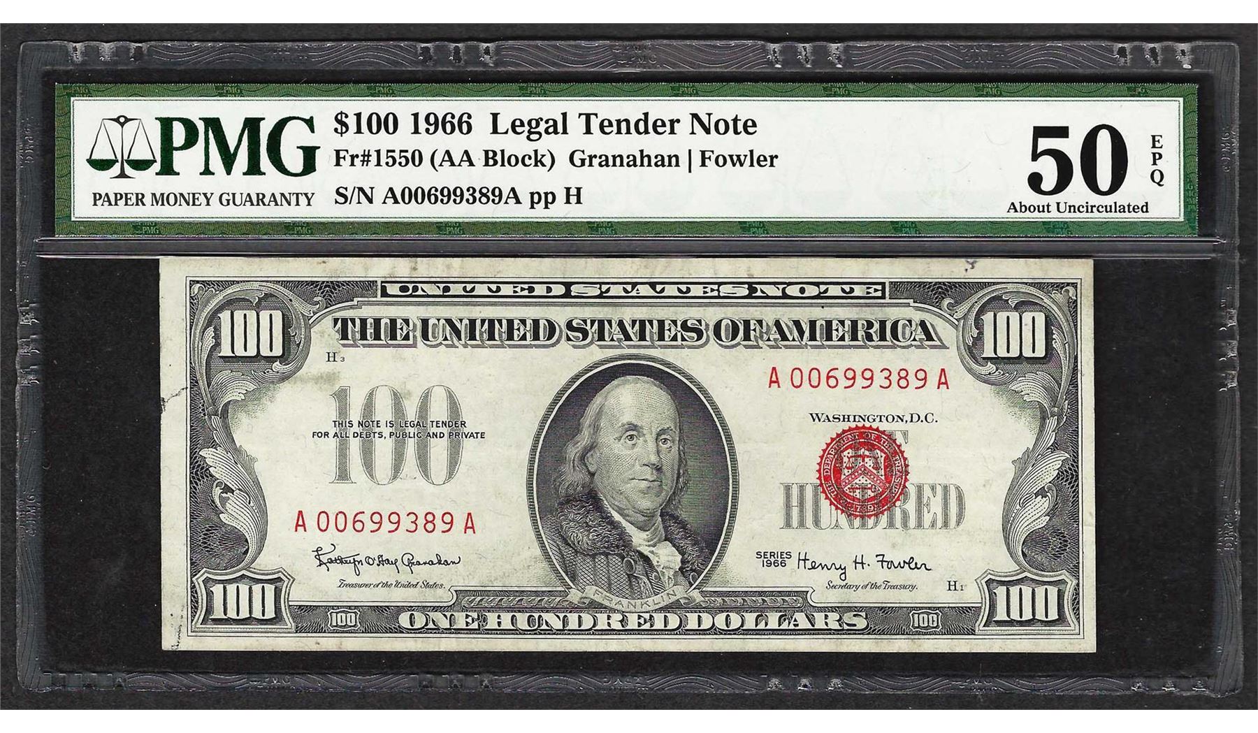 One 1966 $100 Legal Tender Note Fr.1550 PMG About Uncirculated 50EPQ. PMG Certified.