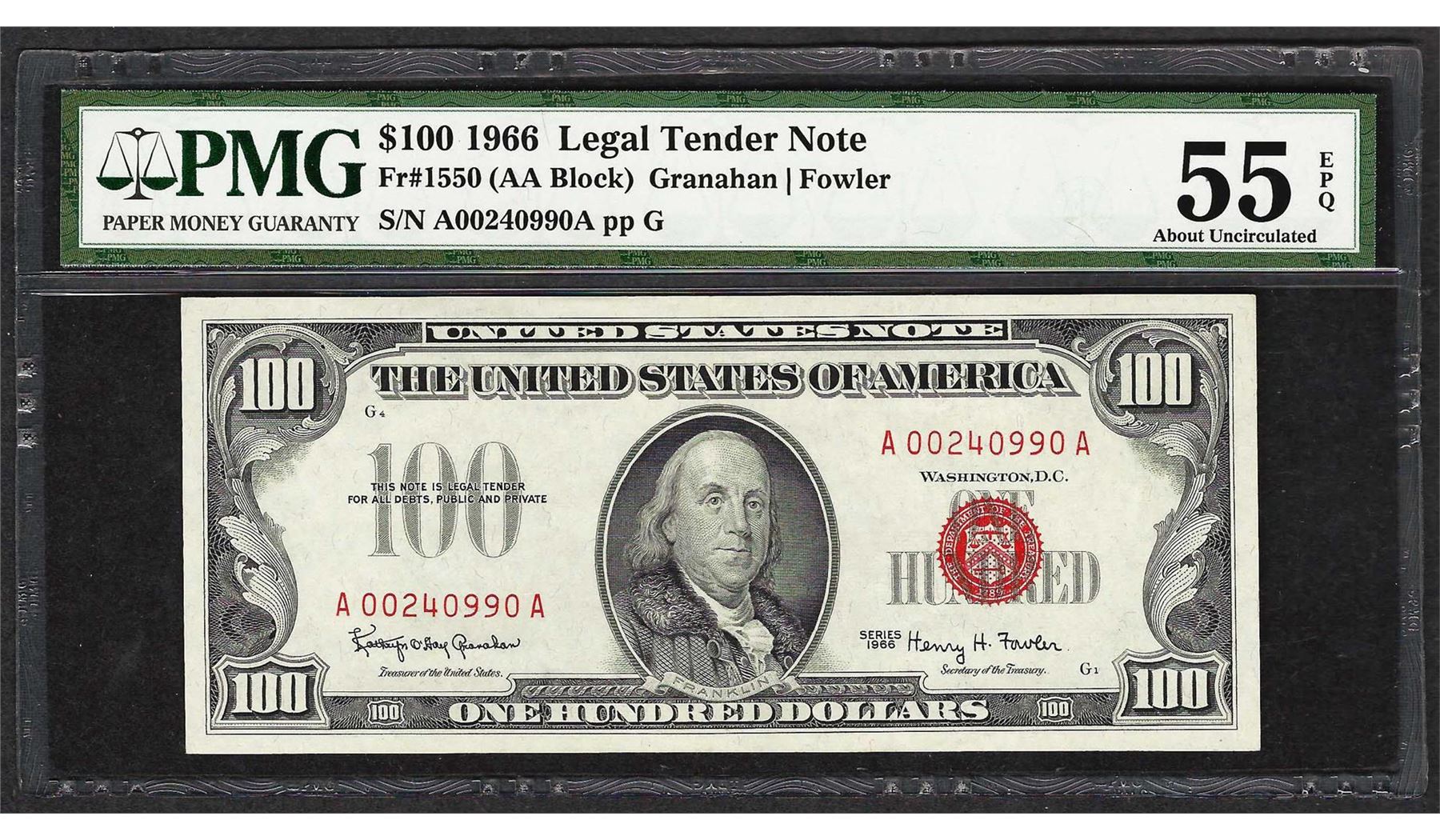 One 1966 $100 Legal Tender Note Fr.1550 PMG About Uncirculated 55EPQ. PMG Appraised.