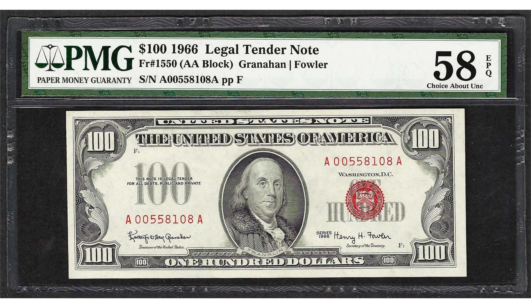 One 1966 $100 Legal Tender Note Fr.1550 PMG Choice About Uncirculated 58EPQ. PMG Certified.