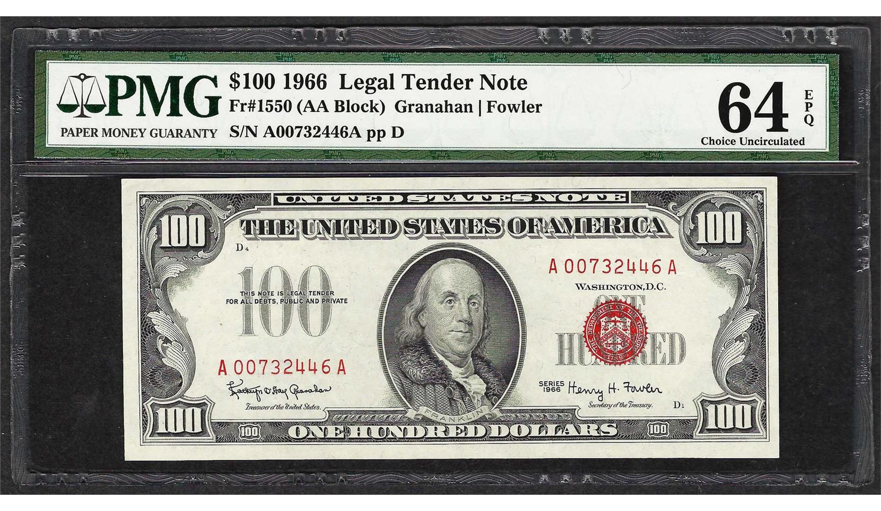 One 1966 $100 Legal Tender Note Fr.1550 PMG Choice Uncirculated 64EPQ. PMG Certified.