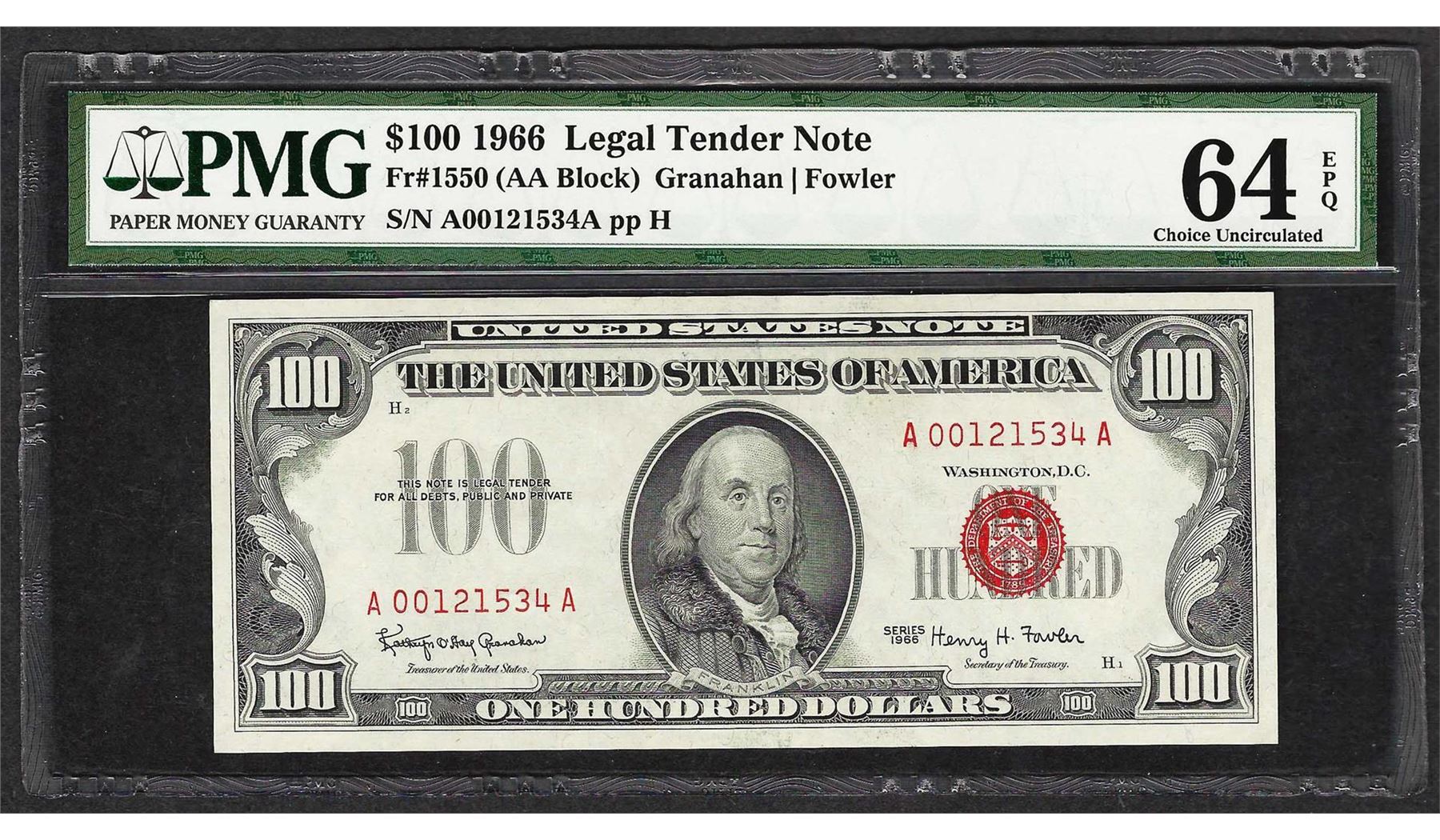 One 1966 $100 Legal Tender Note Fr.1550 PMG Choice Uncirculated 64EPQ. PMG Certified.