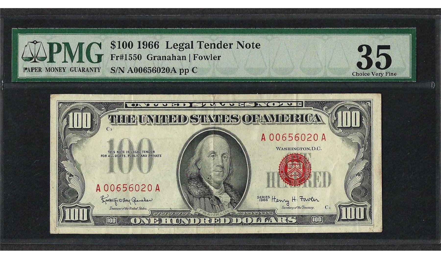 One 1966 $100 Legal Tender Note Fr.1550 PMG Choice Very Fine 35. PMG Certified.