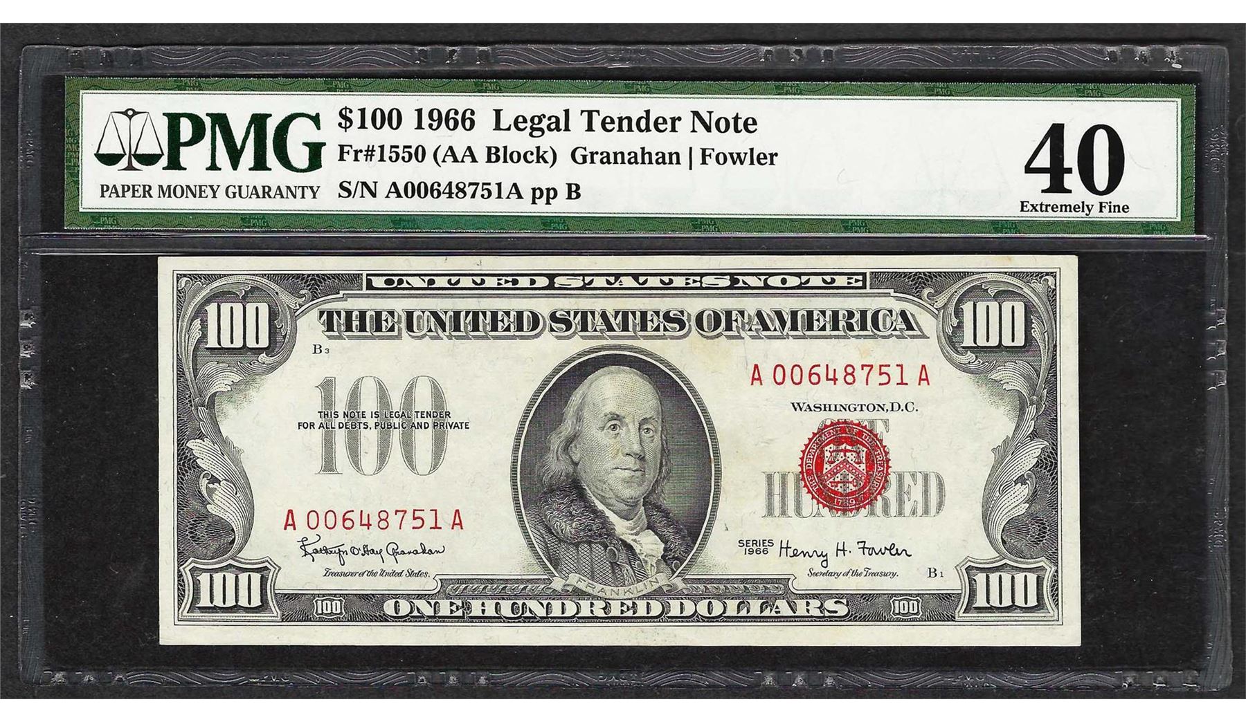 One 1966 $100 Legal Tender Note Fr.1550 PMG Extremely Fine 40. PMG Certified.