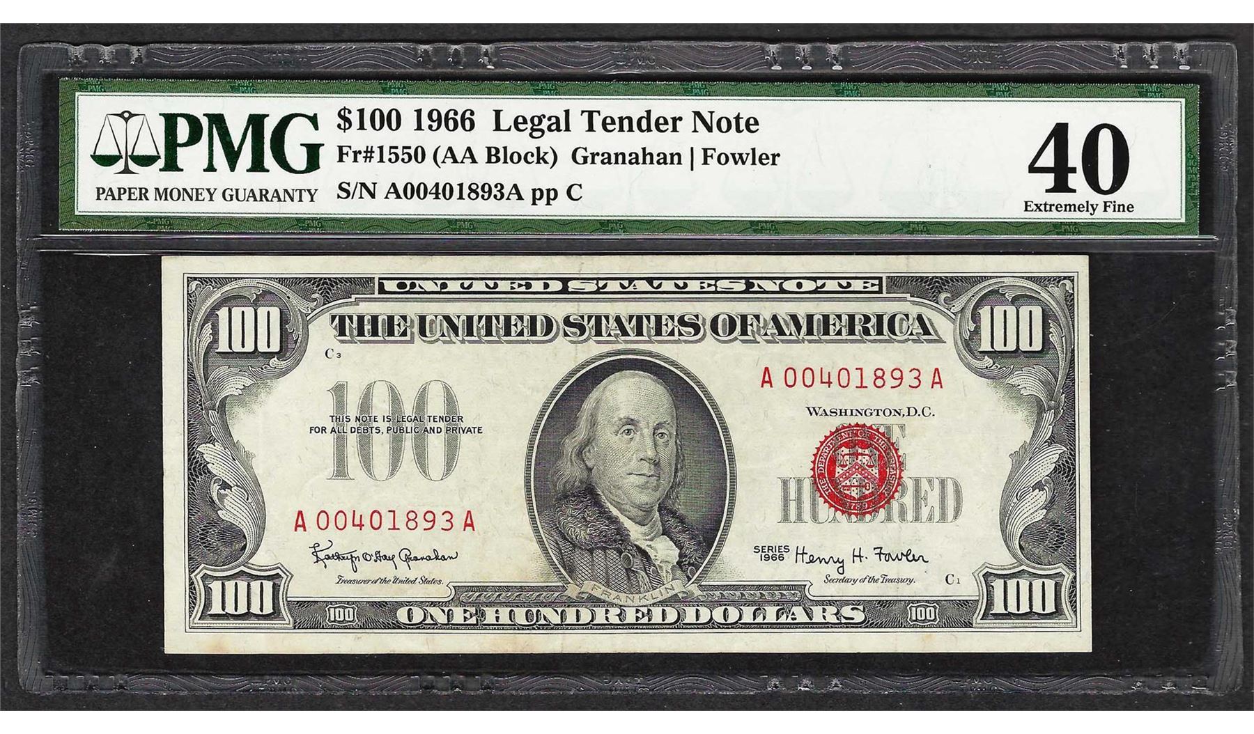 One 1966 $100 Legal Tender Note Fr.1550 PMG Extremely Fine 40. PMG Certified.