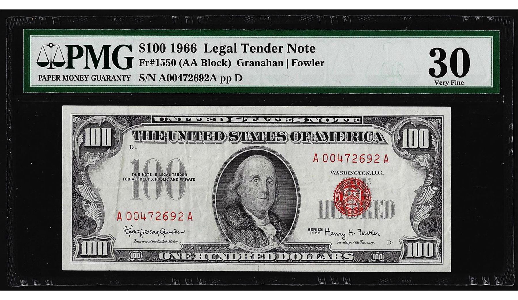 One 1966 $100 Legal Tender Note Fr.1550 PMG Very Fine 30. PMG Certified.
