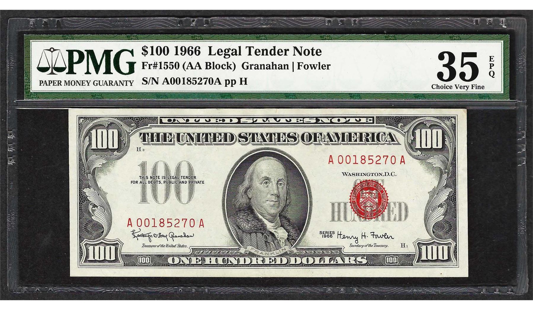 One 1966 $100 Legal Tender Note Fr.1550 PMG Very Fine 35EPQ. PMG Certified.