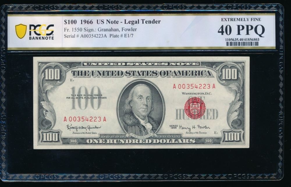 One 1966 $100 Legal Tender Note PCGS 40PPQ.