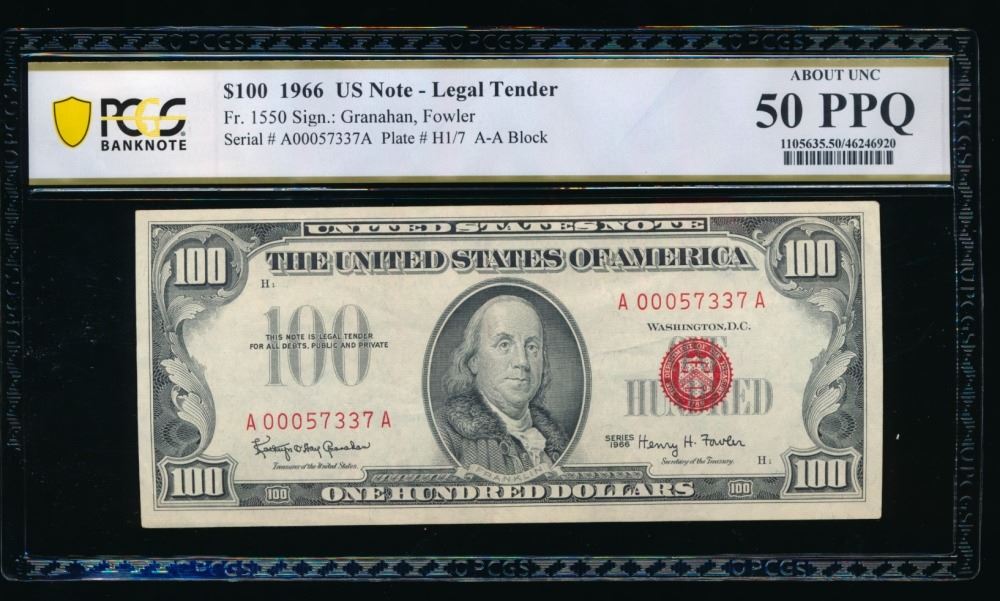 One 1966 $100 Legal Tender Note PCGS 50PPQ.