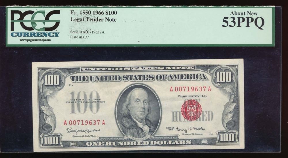 One 1966 $100 Legal Tender Note PCGS 53PPQ.