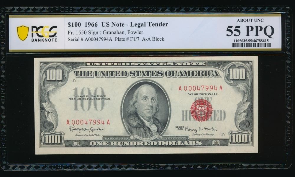 One 1966 $100 Legal Tender Note PCGS 55PPQ.