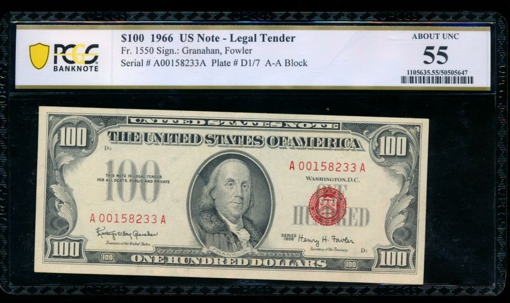 One 1966 $100 Legal Tender Note PCGS 55.