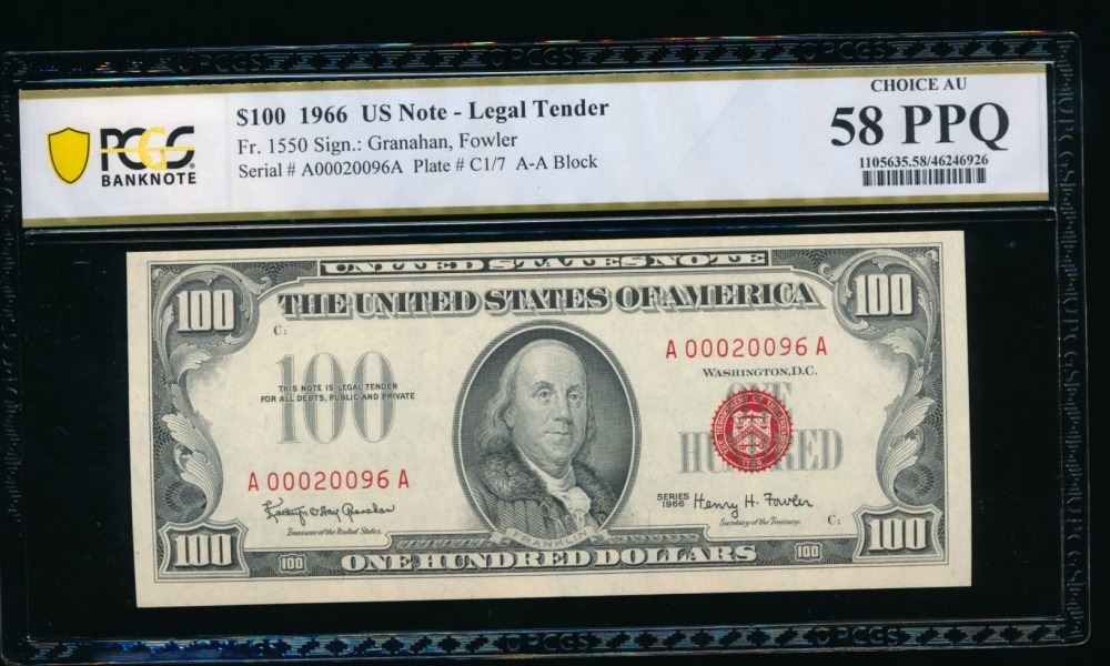 One 1966 $100 Legal Tender Note PCGS 58PPQ.