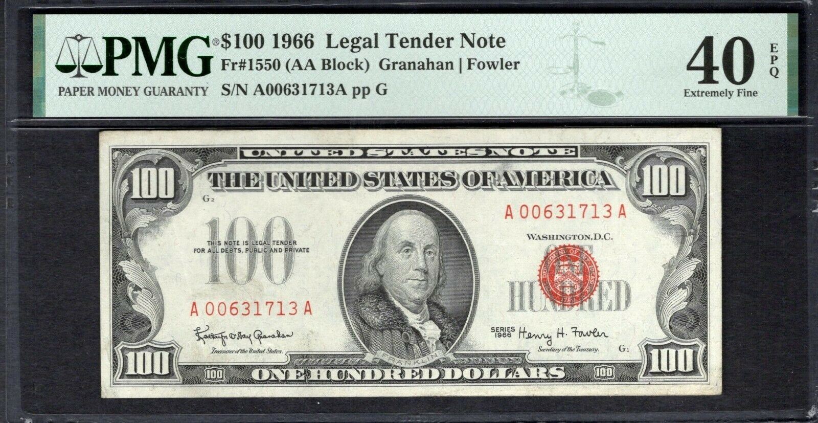One 1966 $100 Legal Tender Note PMG 40EPQ.