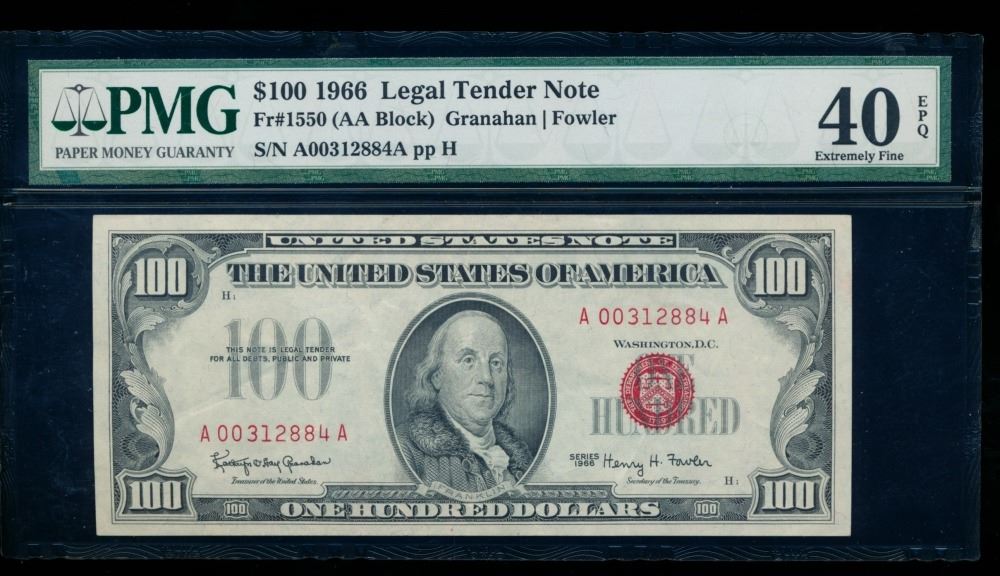 One 1966 $100 Legal Tender Note PMG 40EPQ.