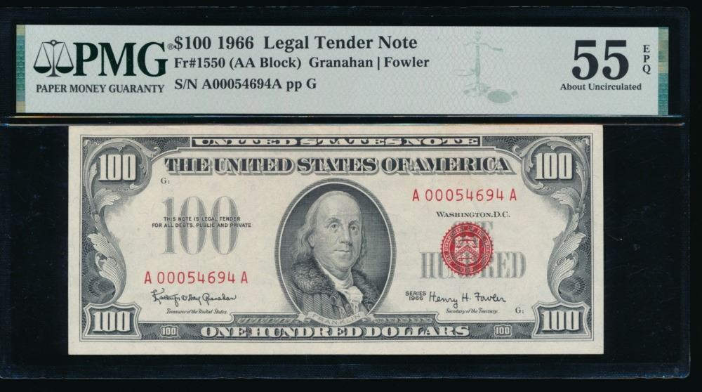 One 1966 $100 Legal Tender Note PMG 55EPQ.