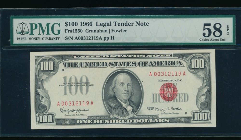 One 1966 $100 Legal Tender Note PMG 58EPQ.