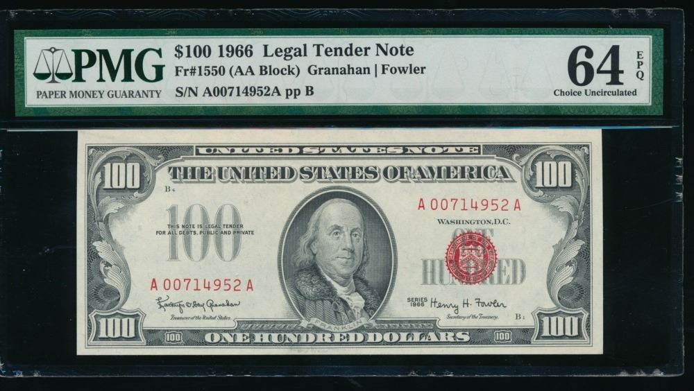 One 1966 $100 Legal Tender Note PMG 64EPQ.
