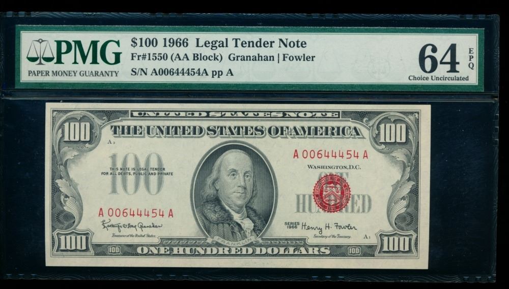One 1966 $100 Legal Tender Note PMG 64EPQ.