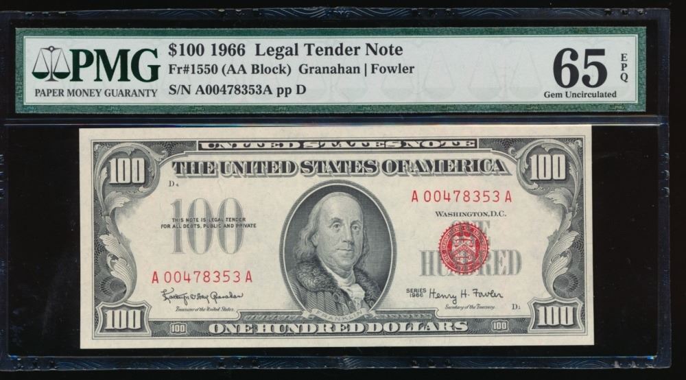 One 1966 $100 Legal Tender Note PMG 65EPQ.